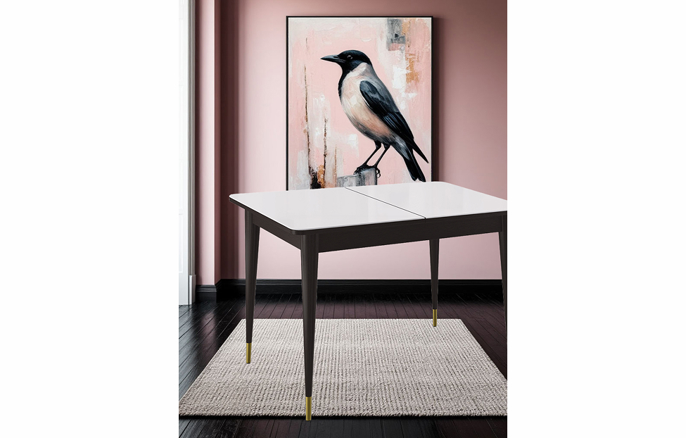 Стол обеденный Мане прямоугольный раздвижной К1100 опоры цвета венге с металлическими наконечниками, столешница - стекло белое сатин.