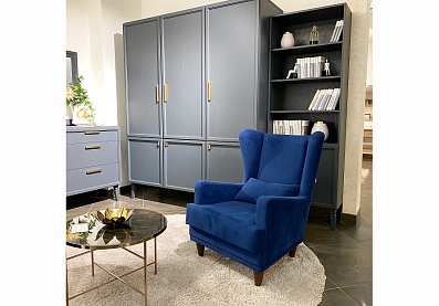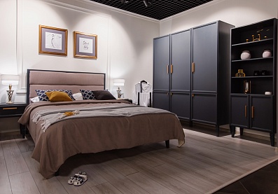 - За глухим фасадом установлена штанга для одежды и полка ЛДСП, за стеклянным – 3 полки ЛДСП;