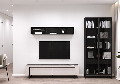 - Один фасад глухой из МДФ 19 мм в пленке ПВХ, а другой рамочный – профиль алюминиевый, стекло затемненное;